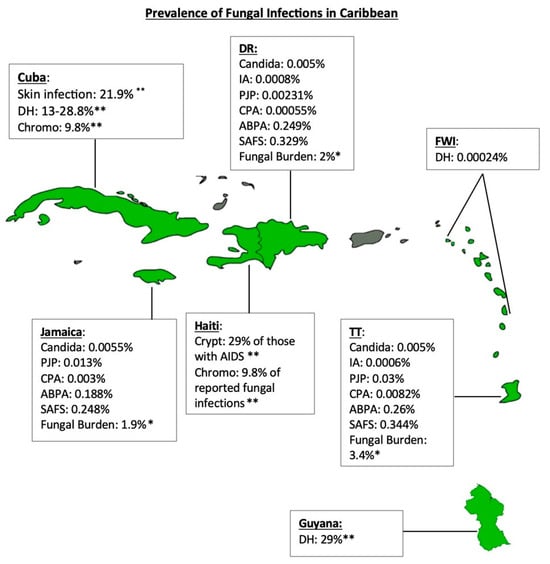 Fungal Infection Prevalence in the Caribbean: map of the Caribbean countries discussed (green) and the available data regarding the reported and estimated prevalence of fungal infections per country based on the literature currently available. Key: DH: disseminated histoplasmosis; Chromo: chromoblastomycosis; PJP: Pneumocystis jirovecii pneumonia; CPA: Chronic pulmonary aspergillosis; SAFS: Severe asthma with fungal sensitization; ABPA: Allergic bronchopulmonary aspergillosis; IA: Invasive aspergillosis; Crypt: Cryptococcus infections. * Percentage of the entire population with a fungal infection; and ** percentage of specific, reported fungal infections.