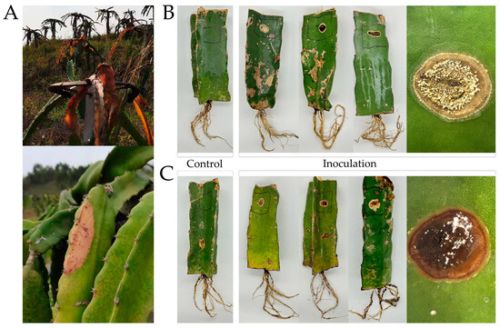 The symptoms of stem rot on dragon fruit. (A) Symptoms in field; (B) pathogenicity test results on stem inoculated with sterile water or the isolate H-4; (C) pathogenicity test results on stem inoculated with sterile water or the isolate H-5.
