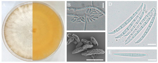 Morphological characteristics of the isolate H-5. Front and back of the colony (A); microconidia observed by optical microscopy (B) or scanning electron microscope (C); macroconidia observed by optical microscopy (D,E); scale bars: 10 µm.