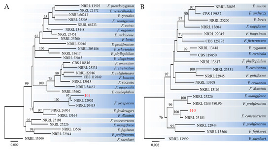 For molecular identification, three distinct fragments of ITS, EF-1α, and RPB2 from strains H-4 and H-5 were sequenced and subsequently submitted to the NCBI database (Table S1). The corresponding sequences of related species were collected, including that of F. sacchari as an outgroup. A phylogenetic tree was constructed using the ML method. The results indicated that the H-4 isolate exhibited the least connection to the phylogenetic cluster containing F. oxysporum, with a confidence rate exceeding 97% (Figure 4A). The H-5 isolate was located on the same branch as F. concentricum (Figure 4B) and demonstrated a 100% support rate.