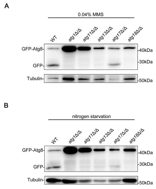 DNA damage has been shown to induce autophagy in mammalian cells and yeast [21,22], and in our previous work, we also found that DNA damage can induce autophagy in C. albicans [40]. The traditional and best-studied autophagy is macroautophagy, also known as non-selective autophagy [41], which is usually activated under nitrogen starvation conditions [42]. Atg proteins play an essential role in autophagy, regulating autophagy at various stages [16,17,18,19,20]. In S. cerevisiae, it has been proven that Atg proteins play different roles in glucose starvation-induced autophagy and nitrogen starvation-induced autophagy (macroautophagy) [43], indicating that different types of autophagy may not require exactly the same Atg proteins. To determine whether the Atg proteins required for DNA damage-induced autophagy and nitrogen starvation-induced autophagy are different, we examined the autophagy of strains lacking Atg proteins under an MMS treatment and nitrogen starvation, and the degree of autophagy was represented by the degree of transition from GFP-Atg8 to GFP [44,45]. Atg8 is subject to vacuolar proteolysis, while GFP is more resistant to proteolysis during autophagy; therefore, the accumulation of free GFP is a measure of autophagic function. The results showed that the atg1Δ/Δ, atg11Δ/Δ, atg13Δ/Δ, and atg18Δ/Δ strains have almost no GFP-Atg8 to GFP conversion under an MMS treatment and nitrogen starvation (Figure 1), suggesting that these Atg proteins play an essential role in both types of autophagy. However, the atg17Δ/Δ strains exhibited weak autophagy under both conditions and seemed to show even weaker autophagy under nitrogen starvation (Figure 1), indicating that the importance of Atg17 in the two types of autophagy is different. The autophagy of these strains under an MMS treatment has been examined in our previous study [40], and the function of Atg1 and Atg11 on macroautophagy has also been identified [46,47]. However, in order to compare the differences between the two types of autophagy more intuitively, we repeated the experiment, and the results were consistent with our previous work [40,46,47]. These data indicated that the core Atg proteins (Atg1, Atg11, Atg13, and Atg18) have essential roles in DNA damage-induced autophagy and macroautophagy, while the function of Atg17 is slightly different between the two types of autophagy.