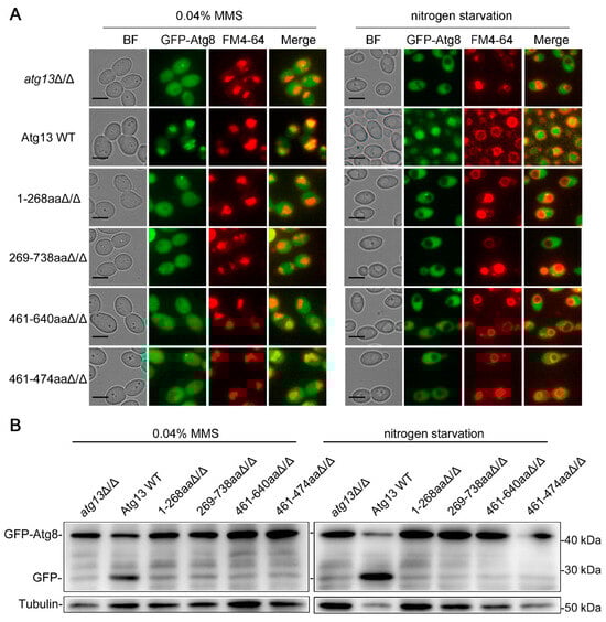 Atg13 is an essential protein in the core autophagic machinery, and its phosphorylation level directly affects the formation of the Atg1 complex, which is crucial for the initiation of autophagy [48]. In S. cerevisiae, Atg13 contains two kinds of structures: an N-terminal HORMA domain and a C-terminal disordered region [49]. Both of these domains are essential for macroautophagy in S. cerevisiae, but their effect on macroautophagy and DNA damage-induced autophagy in C. albicans remains unclear. To investigate the role of the domains of Atg13 in these two types of autophagy, the ATG13 fragments (including the ATG13 promoter, ORF, and terminator sequences) lacking the HORMA domain (1-268aa) or disordered region (269-738aa) were transformed into the atg13Δ/Δ strains, and the degree of autophagy was determined by the well-established GFP-Atg8 processing assay under an MMS treatment and nitrogen starvation. The results showed that the strains lacking the two domains exhibited a similar degree of autophagy as the atg13Δ/Δ strains, and there was almost no vacuole aggregation of Atg8 (Figure 2A and Figure S2A) and GFP accumulation (Figure 2B) in these two strains under an MMS treatment and nitrogen starvation, suggesting that the two domains of Atg13 play an essential role in both types of autophagy in C. albicans. It has been proven that Atg13 461-474aa, a fragment in the C-terminal disordered region of Atg13, was not required for macroautophagy but was required for glucose starvation-induced autophagy in S. cerevisiae [48]. We also examined the role of Atg13 461-474aa and the larger Atg13 461-640aa in the two types of autophagy in C. albicans. The results showed that the absence of Atg13 461-474aa or Atg13 461-640aa almost completely blocks autophagy under two conditions (Figure 2 and Figure S2A), suggesting that Atg13 461-474aa and Atg13 461-640aa are required for DNA damage-induced autophagy and macroautophagy in C. albicans. Together, these data indicated that the N-terminal HORMA domain and C-terminal disordered region of Atg13 are essential for DNA damage-induced autophagy and macroautophagy in C. albicans, and the Atg13 461-474aa are also required for these two types of autophagy in C. albicans.