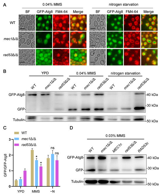 When faced with DNA damage, cells will initiate the DNA damage response to protect themselves [3]. Mec1 and Rad53 are important components in the DNA damage response, and Rad53 is phosphorylated by Mec1 and acts downstream of Mec1 [10]. However, whether Mec1-Rad53 signaling regulates DNA damage-induced autophagy in C. albicans remains unclear. To explore whether Mec1-Rad53 signaling is involved in DNA damage-induced autophagy, GFP-Atg8 was transformed into strains lacking Mec1 or Rad53, and the well-established GFP-Atg8 processing assay was used to monitor autophagy under an MMS treatment and nitrogen starvation [44,45]. The degree of autophagy was represented by the degree of aggregation of GFP-Atg8 into the vacuole and the degree of transition from GFP-Atg8 to GFP. The results showed that under an MMS treatment, the deletion of Mec1 or Rad53 resulted in a decrease in the proportion of cells displaying vacuolar accumulation of GFP-Atg8 (Figure 3A and Figure S1B). Compared with the WT strains, the conversion of GFP-Atg8 into GFP in the mec1Δ/Δ and rad53Δ/Δ strains was significantly reduced under an MMS treatment (Figure 3B,C). We re-transferred MEC1 and RAD53 into the mec1Δ/Δ and rad53Δ/Δ strains, respectively, and found that the autophagy defects under an MMS treatment was successfully compensated (Figure 3D). These results suggested that Mec1 and Rad53 have a positive role in the regulation of DNA damage-induced autophagy. We also examined the autophagy of the mec1Δ/Δ and rad53Δ/Δ strains under nitrogen starvation, and we found that the absence of Mec1 or Rad53 did not affect autophagy under nitrogen starvation (Figure 3 and Figure S1B). These data indicated that Mec1-Rad53 signaling has no regulatory effect on macroautophagy and only regulates DNA damage-induced autophagy specifically.