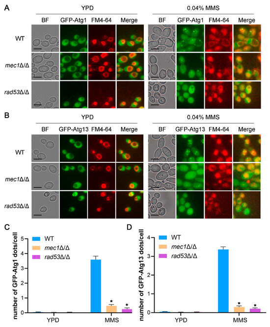 Mec1-Rad53 signaling affects the formation of Atg1 and Atg13 puncta under an MMS treatment. (A) Localization of GFP-Atg1 under an MMS treatment. GFP-Atg1 was expressed in the WT, mec1Δ/Δ, and rad53Δ/Δ strains, and these strains were treated with MMS for 4 h or not. The cells were observed by fluorescence microscopy. BF, bright field. Scale bar = 5 μm. (B) Localization of GFP-Atg13 under an MMS treatment. (C,D) Statistics on the number of GFP-Atg1 and GFP-Atg13 puncta under an MMS treatment. The number of GFP-Atg1 and GFP-Atg13 puncta in each cell was counted. More than 300 cells were counted. Data represent means ± SEM, n = 3. * p < 0.05.