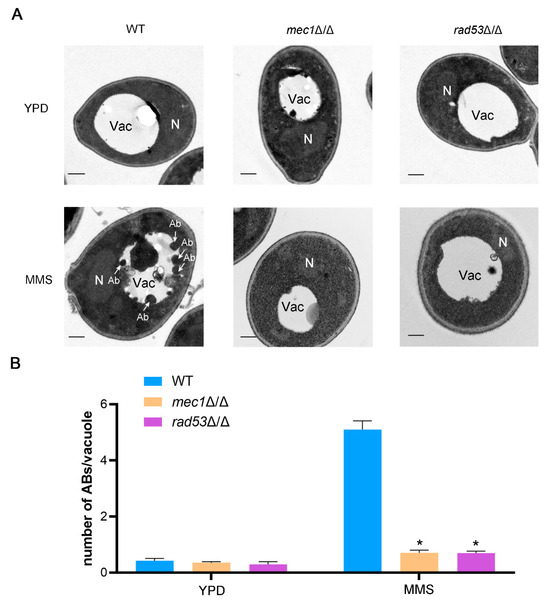 Mec1-Rad53 signaling affects the number of autophagic bodies. (A) Representative electron microscopic pictures of the WT, mec1Δ/Δ, and rad53Δ/Δ strains under YPD conditions and an MMS treatment. The arrow points to autophagic bodies. An amount of 1 mM PMSF was used to prevent autophagic bodies degradation. Scale bar = 500 nm. Ab: Autophagic body; As: Autophagosome; N: Nucleus. Vac: Vacuole. (B) Statistics on the number of autophagic bodies per cell. More than 100 cells were counted. Data represent means ± SEM, n = 3. * p < 0.05.