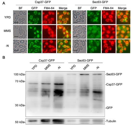 We have proven that DNA damage caused by MMS can induce autophagy in C. albicans [40], and DNA also exists in the mitochondria [51]. In S. cerevisiae, Om45 is a mitochondrial matrix protein, and its degradation can be used to represent the degree of mitophagy [52]. To explore whether DNA damage caused by MMS can induce mitophagy in C. albicans, we labeled Csp37 (a homolog of Om45 in C. albicans) with GFP at the carboxyl terminal in the WT strains, and the GFP accumulation can represent the degree of mitophagy. The results showed that under nitrogen starvation, the localization of Csp37 is similar to that under YPD conditions (Figure 6A), and there is no accumulation of GFP under either condition (Figure 6B), suggesting that mitophagy is not activated under either condition. Under an MMS treatment, the localization of Csp37 was affected compared with that under YPD conditions (Figure 6A), but there is no accumulation of GFP under this condition (Figure 6B), suggesting that DNA damage affected mitochondrial morphology but did not activate mitophagy. We also explored the effect of DNA damage on endoplasmic reticulum (ER) autophagy, another selective autophagy responsible for transporting damaged endoplasmic reticulum to the vacuole for degradation [53]. Sec63 is an ER marker protein, and its degradation level can represent the degree of ER autophagy [53]. The results showed that the morphology of ER did not change under these three conditions (Figure 6A), and there was no accumulation of GFP (Figure 6B), suggesting that DNA damage also did not activate ER autophagy.
