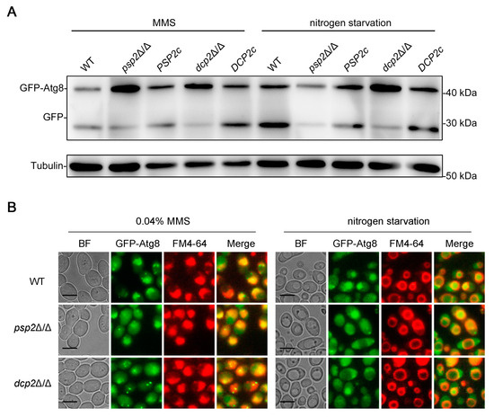 Autophagy is a rigorously coordinated and highly complex process, and its dysregulation is implicated in many human diseases, such as lysosomal storage diseases, cancer, and neurodegeneration [54]. Therefore, the autophagy process must be closely regulated to maintain the appropriate level. Psp2 is an RNA-binding protein, which regulates macroautophagy at the translational level in S. cerevisiae [55]. The decapping enzyme Dcp2 is responsible for removing the 5′-methylguanosine cap of the mRNA and promoting the degradation of mRNA, which regulates macroautophagy at the post-transcriptional level in S. cerevisiae [56]. However, the role of these regulators in DNA damage-induced autophagy and macroautophagy in C. albicans remains unclear. We constructed the strains lacking these regulators and measured their autophagy under an MMS treatment and nitrogen starvation using a well-established GFP-Atg8 processing assay. The results showed that these strains had no significant GFP accumulation under YPD conditions, and only the dcp2Δ/Δ strains had very little GFP accumulation (Figure 7A), suggesting that autophagy did not occur significantly in these strains under YPD conditions. Under an MMS treatment and nitrogen starvation, the psp2Δ/Δ and dcp2Δ/Δ strains exhibited less GFP accumulation and vacuole aggregation of Atg8 compared to the WT strains (Figure 7). We re-introduced the PSP2 and DCP2 into the psp2Δ/Δ and dcp2Δ/Δ strains, respectively, and found that the autophagy defects were successfully rescued (Figure 7A). These results suggested that the absence of Psp2 or Dcp2 inhibits DNA damage-induced autophagy and macroautophagy.