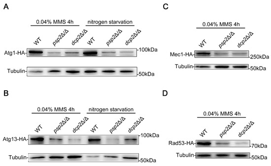 Psp2 and Dcp2 regulates the protein levels of Atg1, Atg13, Mec1, and Rad53. (A) Immunoblotting assay for the protein level of Atg1. (B) Immunoblotting assay for the protein level of Atg13. (C,D) Immunoblotting assay for the protein level of Mec1 and Rad53. The WT, psp2Δ/Δ, and dcp2Δ/Δ strains containing Atg1-HA, Atg13-HA, Mec1-HA, or Rad53-HA were treated with MMS for 4 h or subjected to nitrogen starvation for 2 h, and immunoblots were performed using the HA antibody. The levels of Tubulin served as loading controls.