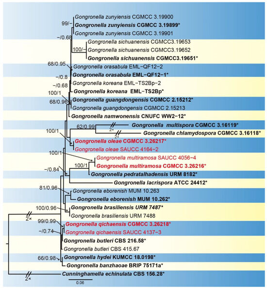 A maximum likelihood (ML) phylogenetic consensus tree inferred from ITS and LSU rDNA sequences, showing relationships among species of Gongronella with Cunninghamella echinulata CBS 156.28 as outgroup. The maximum likelihood bootstrap value (MLBV) and Bayesian inference posterior probability (BIPP) are successively shown at the nodes and separated by a slash “/”. Strains marked with a star “*” and bolded represented are ex-types or ex-holotypes. The strains isolated and sequenced in this study are shown in red. Branches shortened to fit the page are represented by double slashes “//” and folds “×”. The scale in the bottom center indicates 0.06 substitutions per site.