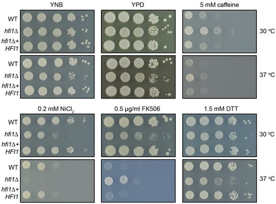 With the availability of the hfi1Δ mutant and its complemented derivative (hfi1Δ + HFI1), the consequences of the loss of Hfi1 from the core module could be investigated. In S. cerevisiae, the hfi1Δ mutant behaved as wild-type on normal synthetic complete media, but was sensitive to caffeine [35]. In this study, we compared the hfi1Δ mutant with the wild-type and the complemented strain hfi1Δ + HFI1 strains on nutrient-rich YPD and synthetic complete YNB. While the strains were indistinguishable at 30 °C, the hfi1Δ strain exhibited impaired growth under the stressful condition of human body temperature (37 °C) on both YPD and YNB media (Figure 1).