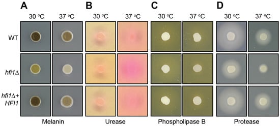 Beyond general stress responses, deletion of HFI1 also influences several virulence traits that are important for C. neoformans during the infection process. Loss of this component of the core module results in reduced production of melanin at both 30 and 37 °C on l-3,4-dihydroxyphenylalanine (L-DOPA) agar, less production of phospholipase B at 37 °C on egg yolk agar, and reduced extracellular protease production at both 30 and 37 °C on BSA media (Figure 2). The phenotype of the hfi1Δ mutant on Christensen’s agar is twofold: first, as shown by the stronger than wild-type orange halo, the hfi1Δ mutant has increased urease activity at 37 °C; second, its growth on this vitamin-free media indicates that the C. neoformans mutant is not a myo-inositol auxotroph, which is a phenotype present in its S. cerevisiae counterpart [35] (Figure 2).