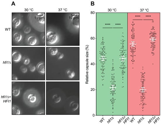 One distinctive characteristic of Cryptococcus among fungal pathogens lies in its polysaccharide capsule, which plays a role in countering the host immune system. Investigation of capsule formation using India ink staining following growth in RPMI 1640 medium revealed that the hfi1Δ strain has a smaller capsule than wild-type (Figure 3A). Significant differences (p-value < 0.0001) were observed between the hfi1Δ strain and the wild-type at both 30 °C and 37 °C (Figure 3B).