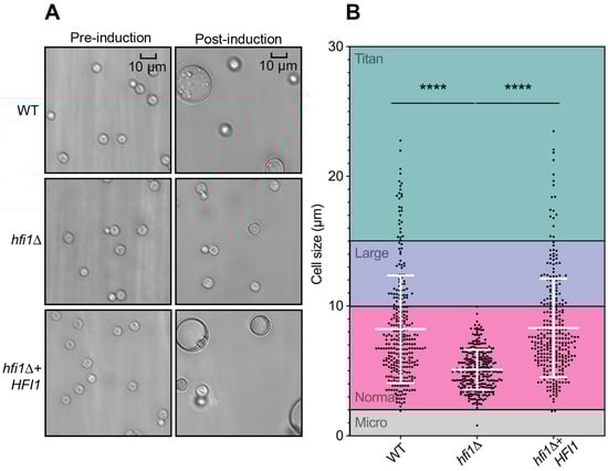 To prevent phagocytic engulfment, C. neoformans cells can increase their physical size to create titan cells while in the host lung [58], an unusual morphotype that allows C. neoformans to change the host immune response and increases antifungal drug resistance [59]. The titan cell phenotype is detectable in vitro following incubation of the pathogen in minimal medium at 30 °C for five days [58]. Intriguingly, the hfi1Δ strain failed to induce titan cell production, and this phenotype was rescued by reintroduction of the wild-type allele (Figure 4A). To further support the observation, measurement of 300 cells’ diameter (excluding capsule) for each strain followed by a statistical analysis were performed. Significant differences (p-value < 0.0001) were observed between the hfi1Δ strain and the wild-type (Figure 4B).