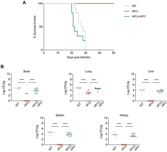 HFI1 is required for virulence of C. neoformans in a murine inhalation model of infection. (A) Five-week-old mice were subjected to intranasal infection with either 105 cells of the wild-type strain, the hfi1Δ mutant strain, or the hfi1Δ + HFI1 complemented strains. Kaplan–Meier survival curves were generated, and statistical significance was determined using log-rank tests. All mice infected with the hfi1Δ mutant strain survived, and there was no statistically significant difference in survival between mice infected with the wild-type strain and those infected with the hfi1Δ + HFI1 complemented strains (p-value > 0.05). (B) Fungal organ burden in the infected mice was assessed for wild-type, hfi1Δ mutant, and hfi1Δ + HFI1 complemented strains. Statistical significance was determined using one-way ANOVA with Tukey’s multiple comparisons test. p-values of < 0.05 were considered significant. Median is represented by a black line. Fungal burden in mice infected with the wild-type strain and hfi1Δ + HFI1 complemented strain was significantly higher (**** p-value < 0.05) compared to mice infected with the hfi1Δ mutant strain.
