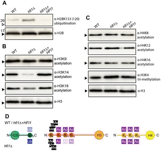 A fundamental role shown for both ScSAGA and HsSAGA is the acetylation of various lysine residues on histones, such as H3K9, H3K14, H3K18, and other lysines present in H4, such as H4K8, H4K12, and H4K16 [60,61,62,63,64]. These acetylation activities are influenced by the tri-methylation of H3K4, which is recognized by HAT module protein, Sgf29 [65,66]. ScSAGA and HsSAGA also mediate the de-ubiquitination of H2B lysine residue, K120 for human or K123 for the brewer’s yeast [67,68]. To investigate whether Hfi1 is required to be in the core module for SAGA modification of histones to occur, the post-translational modification of histones was investigated in wild-type, hfi1Δ and hfi1Δ + HFI1 strains using Western blot analyses (Figure 6).
