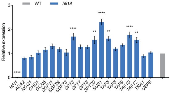 In order to gain deeper insight into the mechanisms underlying the impact of the loss of Hfi1 on histone modifications, we conducted an analysis of the transcript levels of all genes predicted to encode a component of the SAGA complex, comparing transcription between wild-type and the hfi1Δ mutant using RT-qPCR. Interestingly, the deletion of HFI1 resulted in the induction of expression of some SAGA genes (Figure 7); the abundance of SPT3, SUS1, and TAF10 transcripts was significantly increased (p-value < 0.0001), while the abundance of SPT20, TAF5, and TAF12 transcripts was slightly increased (p-value < 0.01). Importantly, the abundance of the histone acetylase-encoding GCN5 or the deubiquitinase-encoding UBP8 genes was not affected, indicating that the effect of histone PTMs in the hfi1Δ mutant is not through loss of the transcription of these genes.