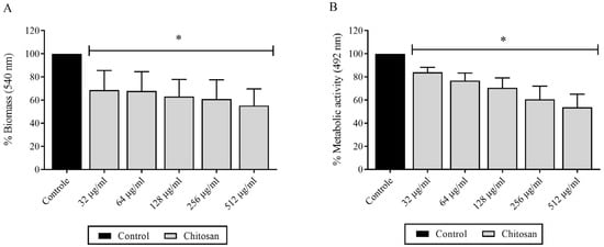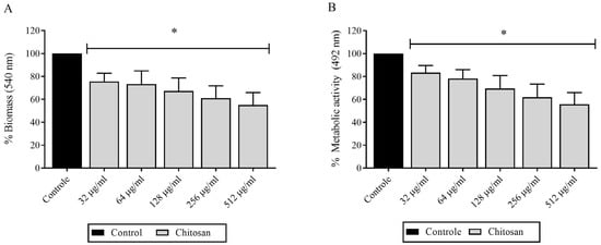Figure 1. Metabolic activity and biomass of H. capsulatum biofilms in filamentous form. exposed to different concentrations of chitosan: (A) Biofilm biomass exposed to drug; (B) Metabolic activity of drug-exposed biofilm. * Significant difference compared to control (p < 0.05).
