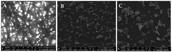 Figure 3. Structure and morphology of the H. capsulatum biofilm. SEM images of biofilms with untreated control, with an arrow pointing to the presence of extracellular polymeric substances (EPS): (A), and with treatment of 512 μg/mL chitosan (B) and 128 μg/mL chitosan (C). There is a reduction in the biofilm caused by the rupture of EPS in the biofilm, with only a few cells adhering to the surface after treatment with chitosan.
