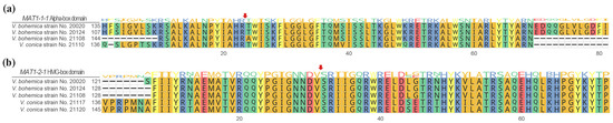 Within the MAT loci of the six investigated strains, aside from MAT1-1-1 and MAT1-2-1, additional open reading frames (ORFs) were detected. For V. bohemica, the top BLASTp hits for Gene05695 of No. 20020, Gene05694 of No. 20124, and Gene05692 of No. 21108 were all the MAT1-1-10 protein of M. sextelata (QQL94615) with e-values of 1 × 10−130, 7 × 10−131, and 9 × 10−109, respectively (Supplementary Table S2). The MAT loci of V. conica strains No. 21117 and No. 21120 exclusively contained the MAT1-2 idiomorph, lacking the MAT1-1 idiomorph, and both harbored another ORF. In the top BLASTp results for Gene05376 of No. 21117 and Gene05383 of No. 21120, apart from the two highest-ranking “hypothetical proteins” in the NCBI database, the best BLASTp hit corresponded to the MAT1-1-11 protein of M. sextelata (QQL94614) (Supplementary Table S2). Following the nomenclature guidelines outlined by Turgeon et al. [14] and Wilken et al. [17], we designated Gene05695 of No. 20020, Gene05694 of No. 20124, Gene05692 of No. 21108, and Gene05312 of No. 21110 as MAT1-1-10, and Gene05376 of No. 21117 and Gene05383 of No. 21120 as MAT1-1-11.