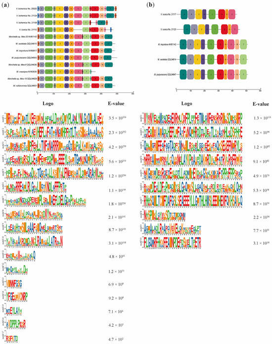 Distribution of conserved motifs of (a) MAT1-1-10 and (b) MAT1-1-11 proteins from Verpa spp. and Morchella spp. The scale bar at the bottom indicates the protein lengths, and sequence logos for each conserved motif are displayed below. Supplementary Figures S5 and S6 provide detailed sequences for each motif.