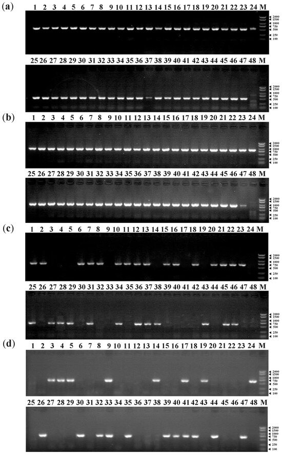 MAT gene PCR products of single-ascospore populations No. 20020 and No. 21120: (a) MAT1-1-1 gene PCR products of No. 20020-1 to No. 20020-47; (b) MAT1-2-1 gene PCR products of No. 20020-1 to No. 20020-47; (c) MAT1-1-1 gene PCR products of No. 21120-1 to No. 21120-47; and (d) MAT1-2-1 gene PCR products of No. 21120-1 to No. 21120-47. The first lane represents the parental strain and the 48th lane contains ddH2O, serving as a negative control in all gel images. ‘M’ denotes DNA marker 2000 (2000, 1500, 1000, 750, 500, 250, and 100 bp).