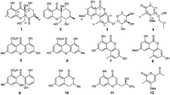 In addition, the other known compounds (5–12) were identified as 6,8-dihydroxy-3-methyl-9-oxo-9H-xanthene-1-carboxylic acid (5) [30], 3,8-dihydroxy-6-methyl-9-oxo-9H-xanthene-1-carboxylic acid (6) [31], alternariol (7), alternariol methyl ether (8) [32], monodictyphenone (9) [33], 3,4-dihydro-6,8-dihydroxy-3-methylisocoumarin (10) [34], 2-(2′S-hydroxypropyl)-7-hydroxychromone’s (11) [35], and wermopyrone (12) [36], respectively, by comparing their HRMS and NMR data to the literature.