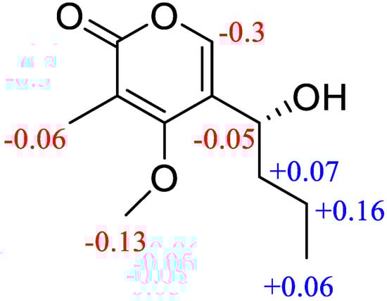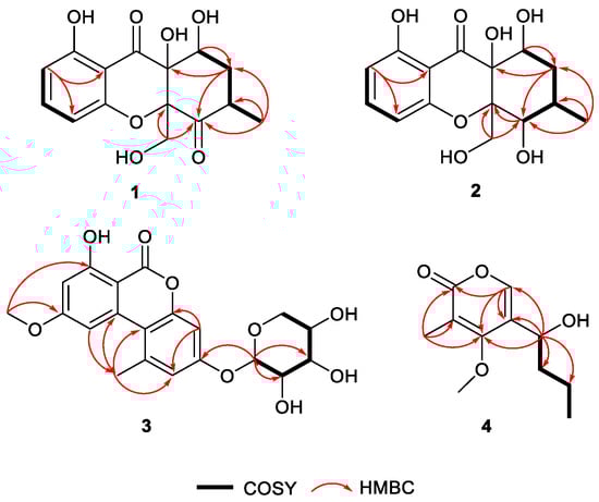 Compound 4 was isolated as a pale yellow oil. Its molecular formula, C11H16O4, was deduced by HR-ESI-MS (m/z 213.1129, [M + H]+, calcd for C11H17O4, 213.1121), indicating four degrees of unsaturation. The 13C and DEPT NMR data demonstrated 11 resonances resulting from two methyls, one methoxy, two methylenes, two methines, and four quaternary carbons signals, including an ester carbonyl group at (δC 164.9, C-2). The 1H-NMR spectral data (Table 2) revealed the signals for one olefinic proton at δH 7.48 (s, H-6), one methoxy group δH 3.95 (s, H-12), two methyl groups at δH 1.99 (s, H-11) and δH 0.92 (t, J = 7.4 Hz, H-10), two methylenes at δH 1.50 (m, H-9) and at δH 1.70 (m, H-8), and one methine at δH 4.63 (m, H-7). The α-pyrone ring structure was confirmed by HMBC correlations (Figure 2) from H-6 to C-2, C-4, and C-5. HMBC correlations from H-7 to C-8, C-9, and COSY correlations of H-7/H-8/H-9/H-10 determined the presence of a butyl side chain. The attachment of the butyl side chain at C-5 was confirmed by HMBC correlation from H-7 to C-4, C-5, and C-6. The attachment of the methoxy group (C-12) was also confirmed by the HMBC correlation between H-12 and C-4. Thus, the planar structure of 4 was deduced, as shown in Figure 1.