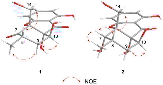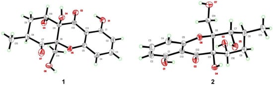 Phomopthane B (2) was isolated as colorless crystals. Its molecular formula, C15H18O7, was deduced by HR-ESI-MS (m/z 333.0950, [M + Na]+, calcd for C15H18O7Na, 333.0945), which was two more mass units than 1. The close comparison of the 1D NMR data between 2 and 1 showed a general similarity (Table 1), except that the ketone at the C-7 position in 1 was replaced by an oxygenated methine at δH 4.42 (H-7) in 2. This assumption was supported by the key HMBC correlations of H3-15 to C-7, C-8, and C-9; H-14 to C-6 and C-7; and H-9 to C-7 and C-11 (Figure 2). H-7 was suggested to have an equatorial position, evidenced by its small J value (2.8 Hz). The relative configuration of the rest chiral centers in 2 was the same as in 1, based on their similar NOESY correlations and coupling constants (Figure 3 and Table 1). The above-mentioned structural elucidation was confirmed by a single X-ray analysis. Unlike 1, 2 crystallized in the monoclinic P21/c space group and has a near-zero optical rotation, suggesting that 2 was a racemic mixture [25,26].