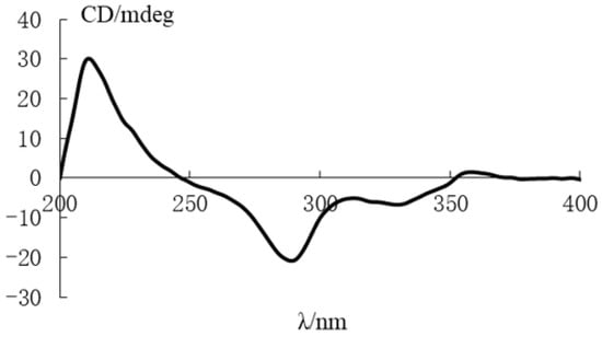 The absolute configuration of 1 was assigned by comparing its electronic circular dichroism (ECD) spectrum with the structurally similar mangrovamide K, of which the absolute configuration has been established. Compound 1 contains the same chromophoric system as mangrovamide K but shows nearly a mirror image on ECD (Figure 5) [24], with a strong positive Cotton effect at 211 nm, negative bands in the 250–350 nm range, and a weak positive Cotton effect at 359 nm. Additionally, 1 has an opposite optical rotation ([α]20D −96.0) compared to mangrovamide K ([α]25D +72.9). Therefore, the absolute configuration of 1 was determined as 6R,8R,10S,11S.
