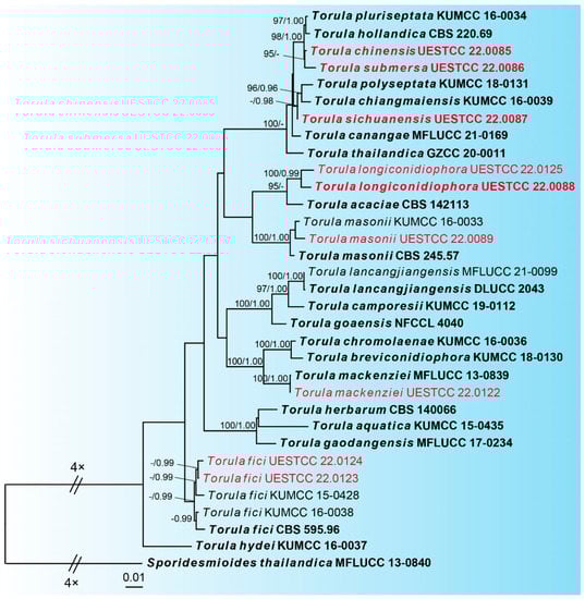 Phylogram of the best ML tree of species of Torula based on a combined dataset of LSU, ITS, SSU, TEF, and RPB2. Novel isolates are indicated in red. Type isolates are in bold. The ML ultrafast bootstrap values/Bayesian PP greater than 95%/0.95 are indicated at the respective nodes. The tree is rooted with Sporidesmioides thailandica (MFLUCC 13-0840).