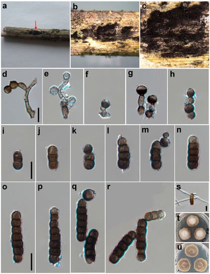 Torula chinensis (HKAS 126509, holotype). (a–c) Colonies on the natural substrate, arrows indicate the locations of colonies. (d–h) Conidiophores, conidiogenous cells and conidia. (i–p) Conidia. (q,r) Conidia in catenated chain. (s) Germinated conidium. (t,u) Culture on PDA from the surface and reverse. Scale bars: (d–s) = 10 μm. Scale bar of (d) applies to (d–h). Scale bar of (i) applies to (i–n). Scale bar of (o) applies to (o–r).