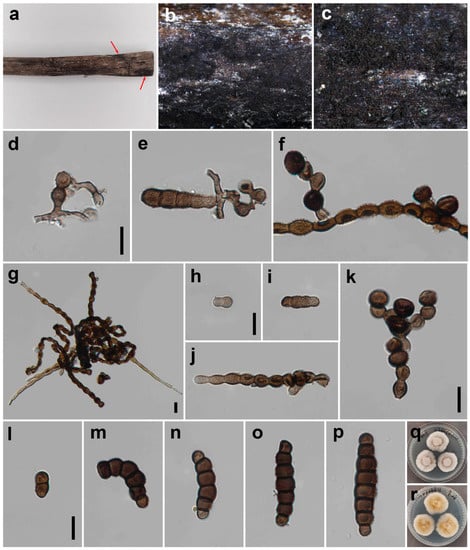 Torula longiconidiophora (HKAS 126512, holotype). (a–c) Colonies on the natural substrate; arrows indicate the locations of colonies. (d–f) Conidiophores with conidiogenous cells. (g) Mass of conidiophores. (h–j) Conidiophores. (k) Conidiogenous cells. (l–p) Conidia. (q,r) Culture on PDA from the surface and reverse. Scale bars: (d–p) = 10 μm. Scale bar of (d) applies to (d–f). Scale bar of (h) applies to (h–j). Scale bar of (l) applies to (l–p).