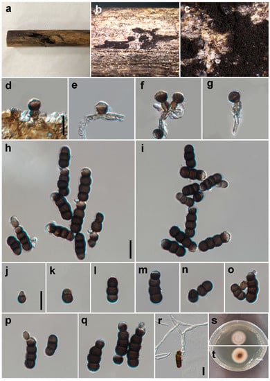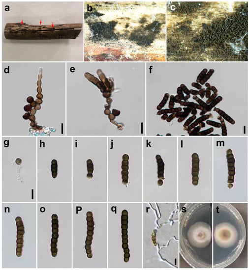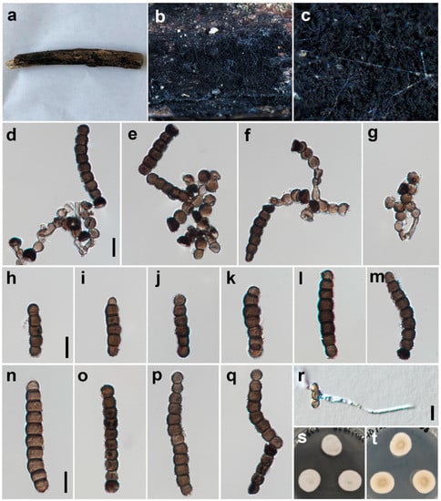 Torula sichuanensis (HKAS 126511, holotype). (a–c) Colonies on the natural substrate; arrows indicate the locations of colonies. (d,e) Conidiophores, conidiogenous cells and conidia. (f) Squash mount of partial colony. (g–q) Conidia; (r) Germinated conidium; (s,t) Culture on PDA from surface and reverse. Scale bars: (d–r) = 10 μm. Scale bar of (g) applies to (g–q).