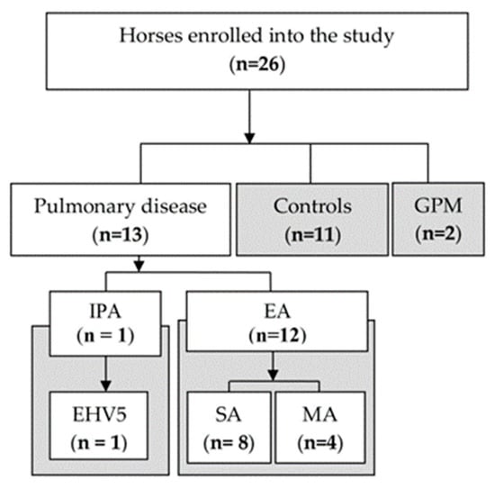 Flowchart of the study. IPA—Invasive Pulmonary Aspergillosis; GPM—Guttural Pouch Mycosis; EHV5—Equine Herpes Virus 5; EA—Equine Asthma; SA—Severe Asthma; MA—Moderate Asthma.
