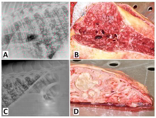 IPA in the equine lungs. Interstitial lung pattern and increased opacity of bronchial walls were recorded by X-ray imaging (A,C). Macroscopic Aspergillus lesions were found in the lungs during autopsy (B,D).