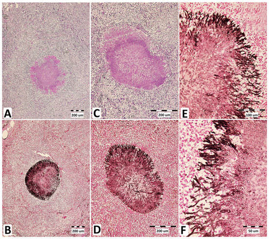 Micromorphology of A. fumigatus lung lesions in a stallion suffering from mycotic pneumonia. Central necrosis in pyogranuloma containing fungal elements visualized using periodic acid (Schiff stain) and Grocott’s methenamine silver (GMS) stain at 100× magnification (A,B) and 200× magnification (C,D), together with Aspergillus hyphae visualized by GMS staining at 600× magnification (E,F).