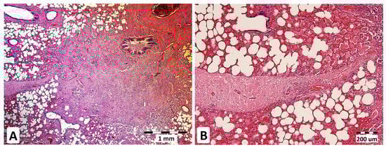 Chronic interstitial pneumonia in equine IPA. The formation of fibrous nodules in the lung parenchyma, HE stains, magnification 40× (A). Multifocal thickening of interalveolar septa with prominent fibrosis (indicated by a strand of fibrous tissue) in a lung parenchyma sample stained with hematoxylin-eosin (HE) (B) at 100× magnification.
