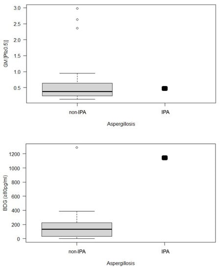 - Dobias, R.; Jaworska, P.; Tomaskova, H.; Kanova, M.; Lyskova, P.; Vrba, Z.; Holub, C.; Svobodová, L.; Hamal, P.; Raska, M. Diagnostic value of serum galactomannan, (1,3)-β-d-glucan, and Aspergillus fumigatus-specific IgA and IgG assays for invasive pulmonary aspergillosis in non-neutropenic patients. Mycoses 2018, 61, 576–586. [Google Scholar] [CrossRef]