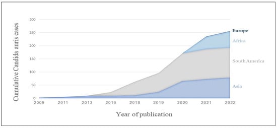 Confirmed cumulative C. auris incidences in children, by official year of publication.