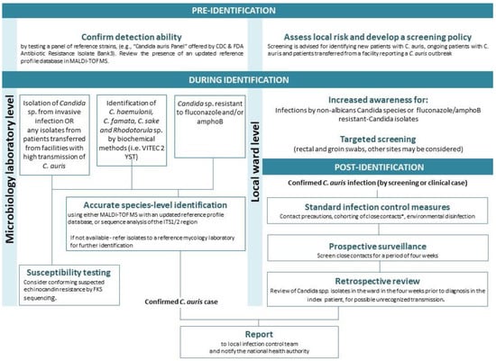 In addition to the above, health authorities should recommend active prospective surveillance for C. auris, namely routine notification of C. auris by laboratories and healthcare professionals [163]. The inclusion of C. auris in the national list of statutory notifiable causative organisms is strongly advised. Some experts have suggested laboratories to review past records of suspected Candida species [164]. Consistent gathering of epidemiological data at national and international levels will enable informed and coordinated risk management actions by public health authorities.