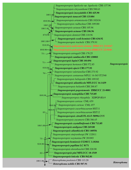 Notes: There are 52 accepted species in this genus (Species Fungorum. http://www.speciesfungorum.org/Names/Names.asp, accessed on 14 August 2022). Members of the Stagonosporopsis are saprobes on dead plant materials, and some species have been reported from house dust and garden soil [12]. Some species of Stagonosporopsis can cause devastating diseases on a wide range of economically important plants, including those found in farmlands, forests, grasslands, and other natural ecosystems [5]. Stagonosporopsis species have been reported as severe pathogens of some crops and ornamentals in several countries, including Australia China, France, India, Italy, Turkey, and the United States [55,56,57,58,59].