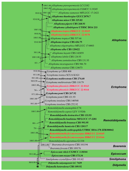 Notes: Allophoma was introduced to accommodate phoma-like taxa with various-shaped conidia [7]. Currently, 14 species are accepted in the genus [14] (Species Fungorum. http://www.speciesfungorum.org/Names/Names.asp, accessed on 14 August 2022). Allophoma species are phytopathogens or saprobes on leaves, pods, and stems and some are human and animal pathogens [33,42,43]. Allophoma labilis (Sacc.) Qian Chen and L. Cai often causes leaf necrosis, canker, and stem lesions, or stem rot in various plants [18,44,45,46,47,48], and A. tropica can cause necrosis in a wide variety of ornamental plants [42]. In addition, A. cylindrispora Valenz-Lopez, Stchigel, Guarro and Cano was isolated from a lesion of the human eye [43] and A. oligotrophica Qian Chen, Crous and L. Cai is an air borne fungus [49].