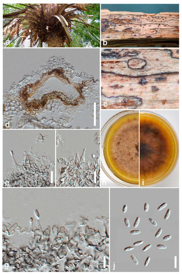 Ectophoma phoenicis (ZHKU 22-0093, holotype). (a) Host. (b,c) Conidiomata on the substrate. (d) Vertical section of a conidioma. (e–g) Conidiogenous cells attached to conidia. (j) Conidia. (h,i) Colonies on PDA (i) from the bottom. Scale bars: d = 100 μm, e–h = 15 μm.