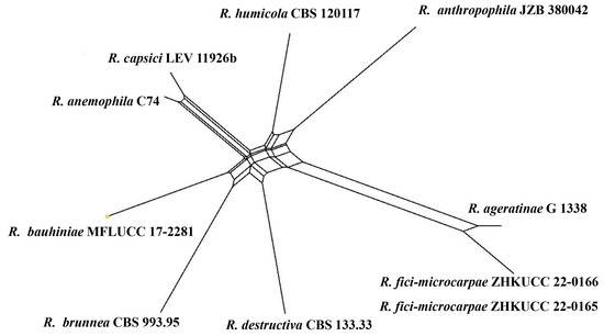 Notes: The combined gene analysis of ITS, LSU, RPB2, and β-tubulin (Figure 2) showed that our isolates (ZHKUCC 22-0165, ZHKUCC 22-0166) grouped with the type strain of Remotididymella ageratinae (CGMCC 3.19991) with a strong support value (100% in ML, 1.00 in BI). Result of PHI analysis of Remotididymella species showed a value of Φw = 0.26 and there was no significant genetic recombination (Φw ≥ 0.05) between these novel species of Remotididymella and other species in this genus (Figure 7). A comparison of the DNA sequences of ITS, LSU, RPB2, and β-tubulin locus of our isolates (ZHKUCC 22-0165, ZHKUCC 22-0166) with the type strain of R. ageratinae revealed base pair differences of 6/488, 8/893, 9/595, 3/332, respectively.