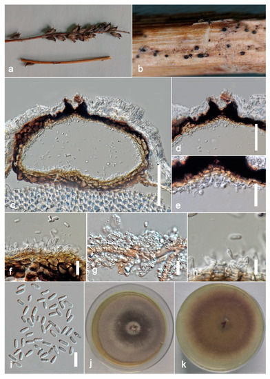- Tibpromma, S.; Hyde, K.D.; Jeewon, R.; Maharachchikumbura, S.S.N.; Liu, J.K.; Bhat, D.J.; Jones, E.B.G.; McKenzie, E.H.C.; Camporesi, E.; Bulgakov, T.S.; et al. Fungal diversity notes 491–602: Taxonomic and phylogenetic contributions to fungal taxa. Fungal Divers. 2017, 83, 1–261. [Google Scholar] [CrossRef]