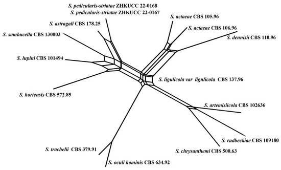 Morphologically, our collections are different from Stagonosporopsis astragali by short papillate, larger conidiomata (150–200 × 300–400 μm), and oblong to ellipsoid conidia without polar guttules. In contrast, S. astragali is an opportunistic pathogen producing smaller conidiomata (80–180 μm diam.) with 0–3 papillate ostioles, and cylindrical to allantoid conidia with numerous polar guttules. Therefore, we introduce this collection as Stagonosporopsis pedicularis-striatae sp. nov. This fungus has often recorded in North America (United States and Canada) on stems of various species of Astragalus [51].