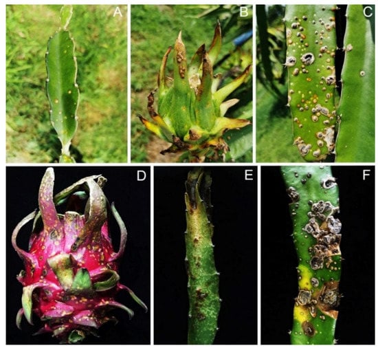 Canker of Hylocereus polyrhizus observed in the field: circular sunken orange cankers on cladode (A) and fruit (B); black pycnidia formed on the surface of cankers on cladodes (C) and fruit (D); and infected tissues that became rotted (E,F).