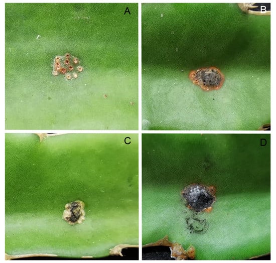 Pathogenicity test of three Neoscytalidium sp. isolates by means of agar plug method on wounded H. polyrhizus cladodes: control (A), PSU-HP01 (B), TSU-HP01 (C) and TSU-HP02 (D).