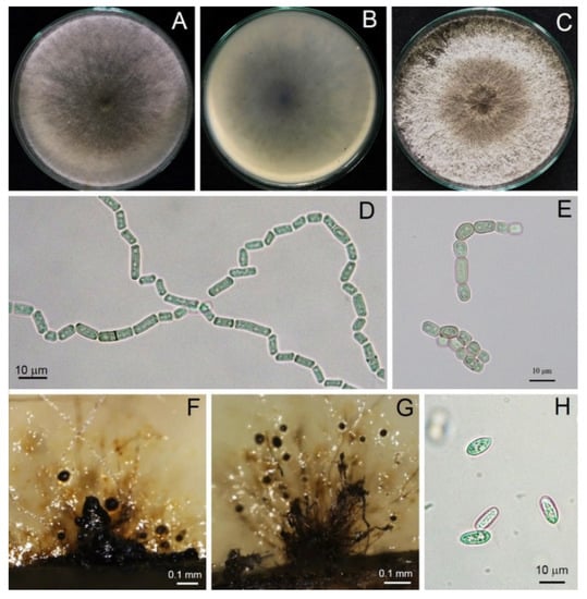 | TSU-HP01 | White, moderate growth of 3 cm/day, olive green to gray color and turned dark gray to black after 12 days | Ellipsoid to ovoid, globose, oblong–cylindrical, singly or in arthric chains, 0- to 2-septate, 3.70–9.65 (6.24 ± 1.77) × 2.46–6.15 (3.73 ± 1.04) μm, length/width ratio = 1.67 | Rarely produced on PDA after 4 weeks of incubation, brown to dark brown, singly or in aggregates | Ellipsoid, oblong or cylindrical, 9.81–13.52 (11.48 ± 0.93) × 3.73–5.04 (4.27 ± 0.36) μm, length/width ratio = 2.68 | This study |
