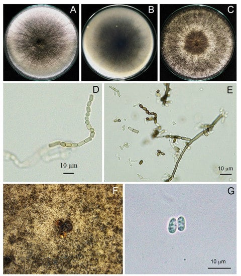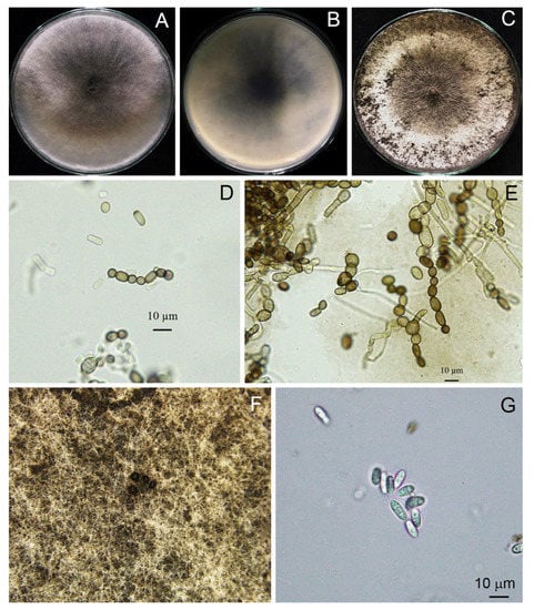 Morphological characteristics of Neoscytalidium sp. (TSU-HP02): three-day-old colony on PDA—top (A) and bottom views (B); one-week-old colony on PDA (C); arthroconidia ((D,E); ×400); black pycnidia (F); and pycnidial conidia ((G); ×400).